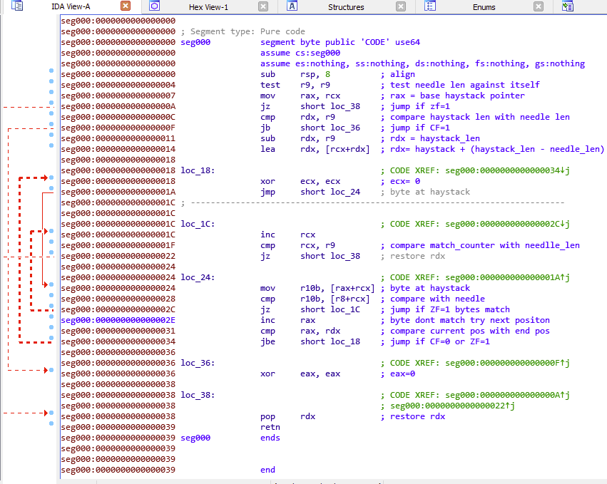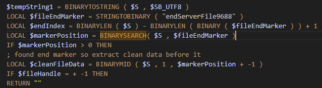 The BINARYSEARCH function is much like memmem. It’s a raw byte-pattern search. You give it a buffer and a needle; it returns the first match or NULL. In the malware it's used to finding the protocol markers we mentioned above in network data for the C2; "endServerFile9688" etc.