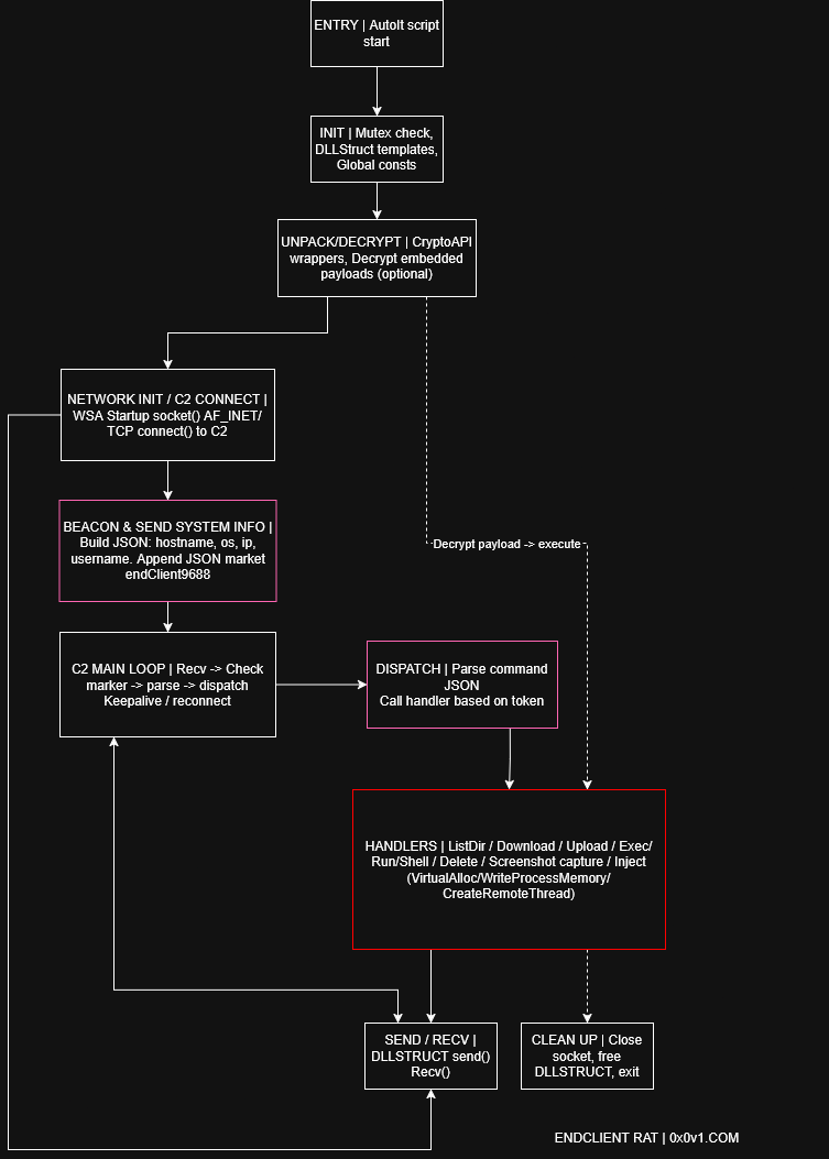 Above I have detailed a relatively high-level diagram of the control flow of the EndClientRAT. This doesn't include the in memory functionality, and mostly covers the on disk malware functionality interpreted by the AutoIT interpreter. The in memory functionality is to support the C2 protocol can be found in the later section.