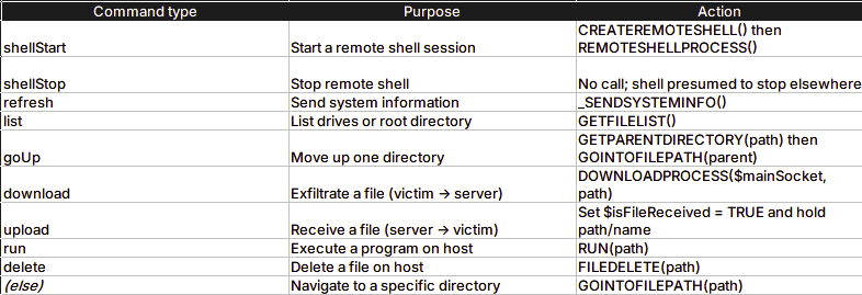 C2 command dispatcher can initiate the following (note function names are pseudo-code and were obfuscated naturally) :