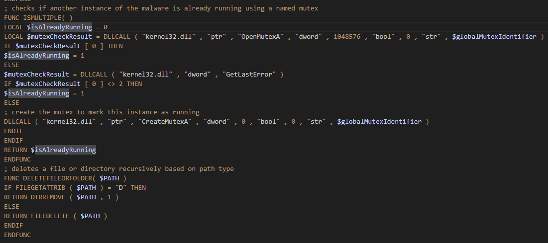 Kimsuky have a habit of AutoIT payloads. In 2023 I reported a finding of another, less sophisticated AutoIT RAT used to target HRDs which was highly similar to xRAT/Quasar. As with most of these cases, you will see in the VirusTotal collection that these samples have low AV scores and demonstrably is an effective way for NK TA's to bypass common AVs. Since AutoIT scripts are most commonly compiled, AV's have a hard time with them and TA's have a good time with them. This was the case with EndClient RAT, and you'll need to pull it from the memory of the AutoIT executable if you want it de-obfuscated. To save you the bother, I have done this and uploaded it to the VirusTotal collection.