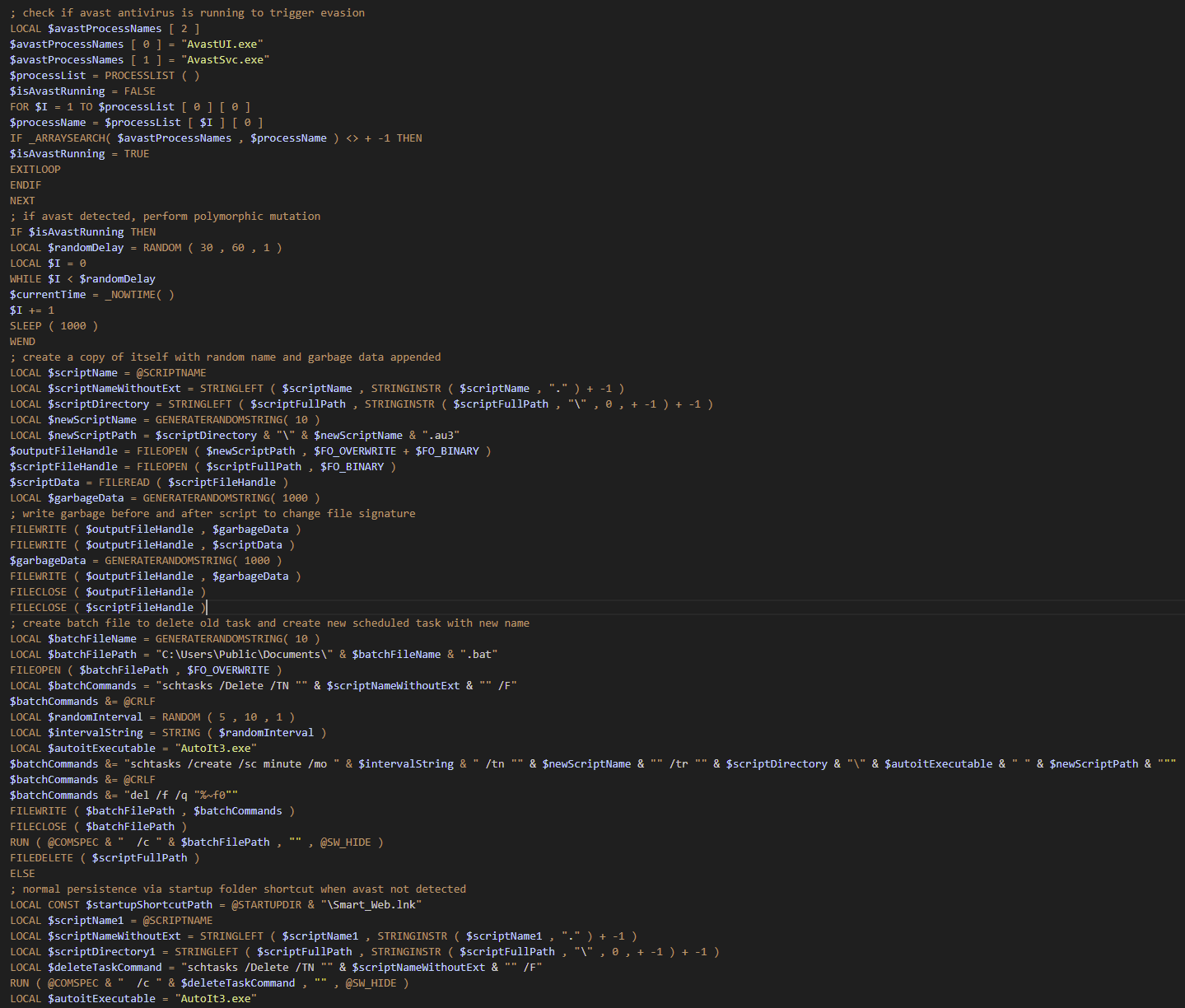 Next the ware checks for Avast antivirus, if it finds Avast, it creates a polymorphic mutation of the file, with garbage data and a new filename. Then modifies the new persistence mechanism that you saw above.