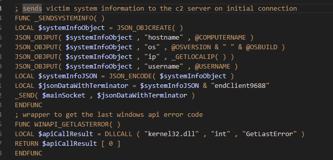 Once the C2 connection is established, it begins sending it's first system information beacon containing the computer name, OS version, username and IP. Notably here, the it creates a JSON marker of "endClient9688" which is a vitally important aspect of the C2 protocol for this malware.