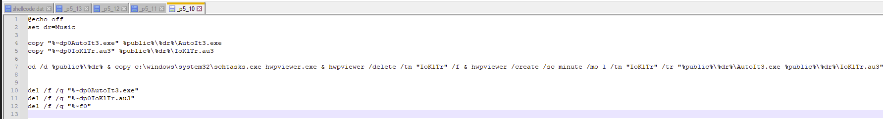 The BAT dropper sets up persistence via a scheduled task, then self-cleans. It drops the AutoIt payloads into Public\Music, registers a task “IoKlTr” that executes it every minute, then removes traces of the installer.