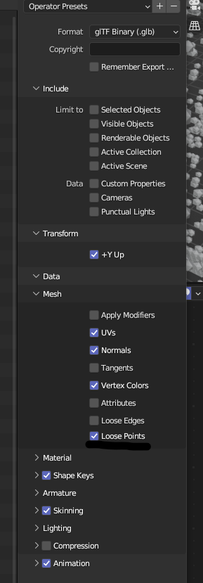 When you wish to export your 3D model, export to .GLB file. In your export settings ensure you select Mesh > Loose Points, otherwise your pointcloud will not render.