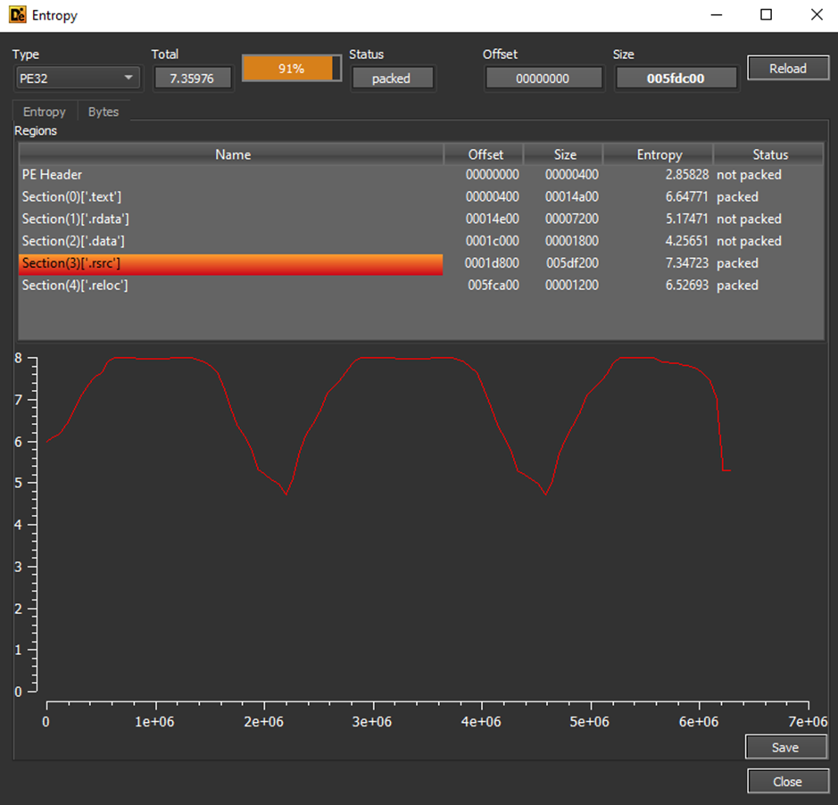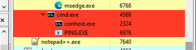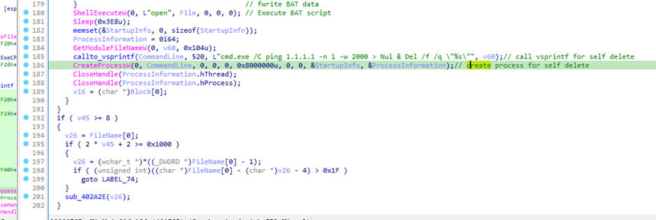 Following this execution, the section stage shellcode is executed and the dropper calls vsprintf to execute command line argument “cmd.exe /C ping 1.1.1.1 -n 1 -w 2000 > Nul & Del /f /q \”%s\”” to delete itself.