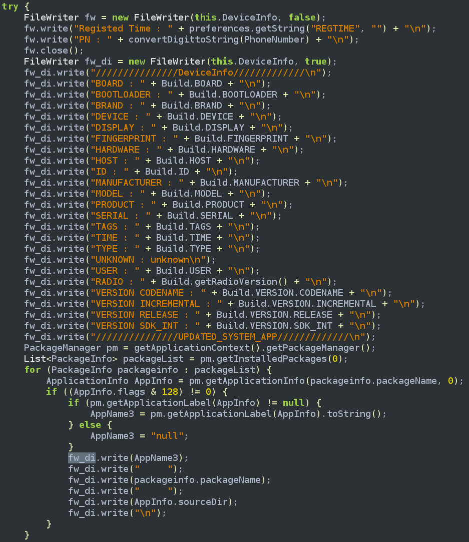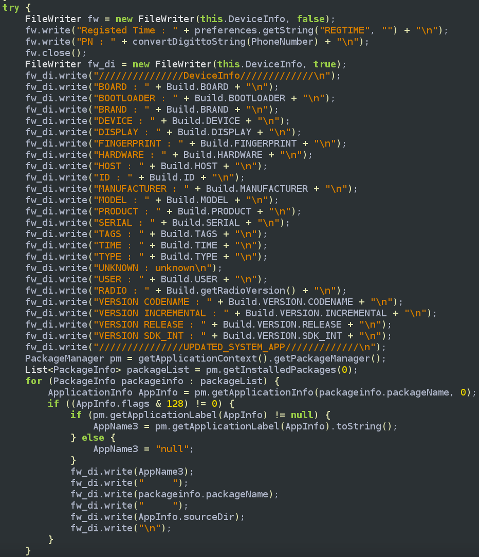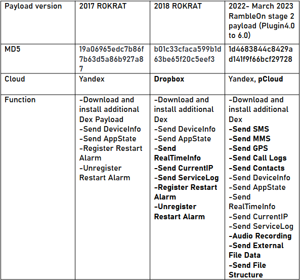 The changes between the 2017 Android ROKRAT payload discussed in the DOKKAEBI campaign and the sample we found from the middle of 2018 are significant. The 2017 ROKRAT sample (bded85d7024b6cf86cc9ce45ec851c80cb13790b9c4bd63b0b22b0fb672e9dce) operates as a loader/dropper, using Yandex Cloud to download a secondary payload and the DexClassLoader functionality in Android to run the additional payload. The 2018 ROKRAT sample, does the same, however performs minor reconnaissance and persistence activity. In addition, during this sample version, they utilized Dropbox rather than Yandex. What is most notable with the mid-2018 is this version demonstrates a closer (and in some cases a line for line) code match with RambleOn. When considering the functionality, if we compare all three payloads, the 2017 ROKRAT sample from the DOKKAEBI campaign, the mid-2018 ROKRAT sample we have identified here and RambleOn’s 2022 to March 2023 secondary payload we see the following iterations: