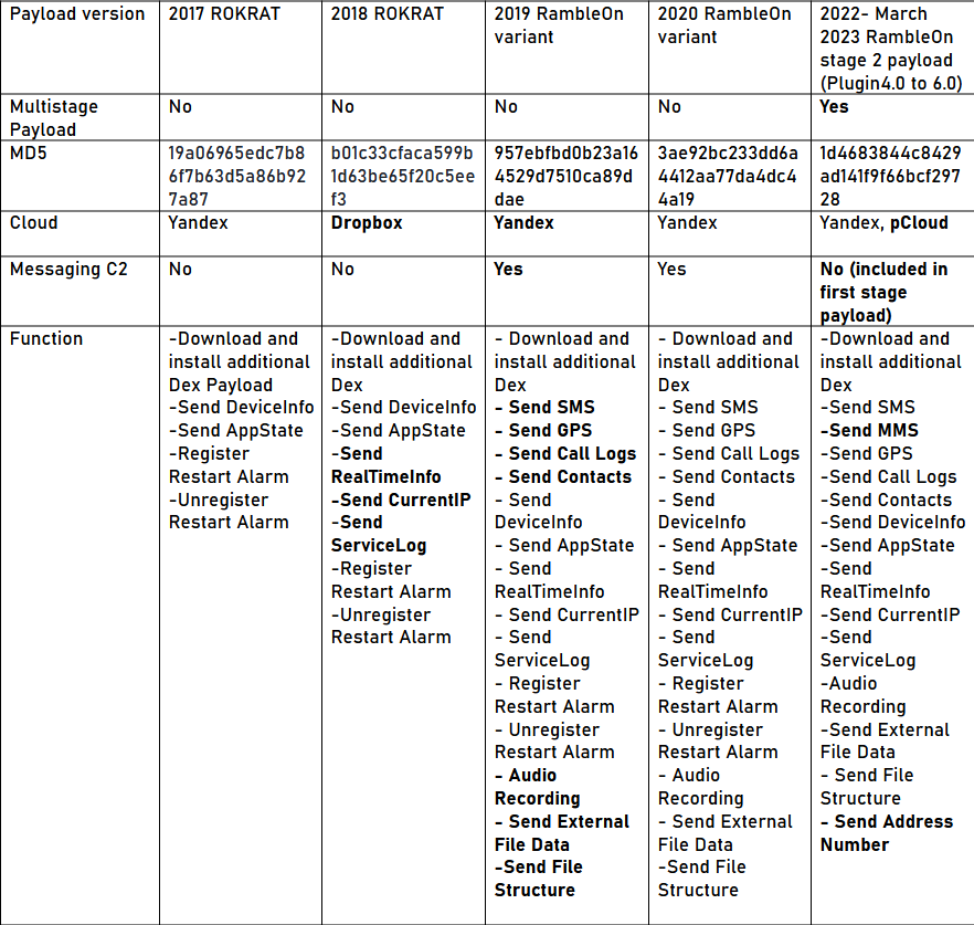You can see here, that the distinction between ROKRAT and RambleOn, lies in significant re-engineering of ROKRAT malware to include a greater amount of exfiltration and C2 functionality. Further, you can see how ROKRAT originally was intended to be a dropper/loader. With the code similarities demonstrated in Table 3 and the functionality comparison in Table 4, you can see evidently clear correlations between ROKRAT and RambleOn. Furthermore, the evolution of RambleOn to become a multistage payload in 2022 onwards demonstrates the threat actor’s clear intention of progressing their Android malware capability.