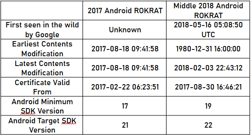 Table 1 Comparative data between the 2017 and 2018 versions of ROKRAT Android malware