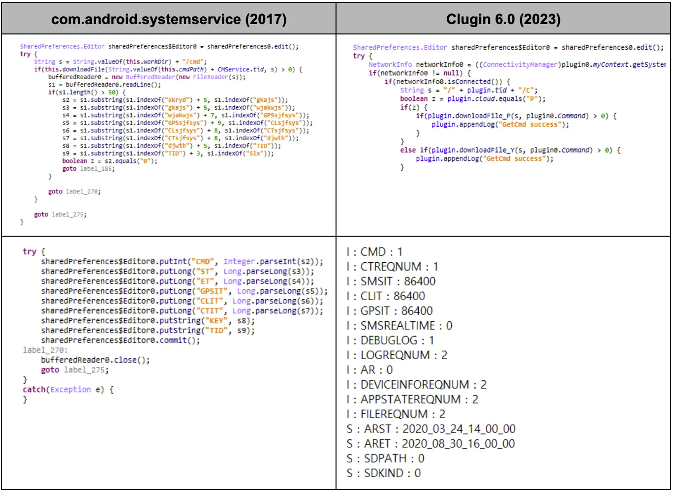 Further to this, I conducted analysis on the malicious APK used in the comparison by S2W, seen on the left side of Figure 1, with process name “com.android.systemservice”. This sample was classified as a ROKRAT Android variant and observed in an attack campaign classified as DOKKAEBI. This campaign was attributed to North Korean state funded group APT37. I acknowledge S2W’s correlations with RambleOn and the ROKRAT Android variant observed in DOKKAEBI, particularly with regards to utilizing cloud services to modify SharedPreferences to facilitate C2 communication.