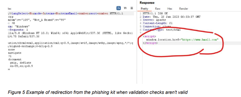 The phish kits observed in campaigns lead by UCID902 do not appear to differ throughout my observations since 2021. Across my cluster, I have indexed DOM content of all phishing sites observed in these campaigns, resulting in all of them correlating with each other. In the phishing email, the URI (contained as a link on the green button displayed in Figure 4) contains two values that determine the targeted and the redirect. I have identified a specific encoding which the actor utilises to encode the request query parameters, which I have seen throughout campaigns lead by UCID902. When the user inputs credentials on the phish kit, I note the credentials are send in a POST request back to the comprised hosting webserver. If the originating GET request doesn’t meet requirements or contain the victim identifier, the user is redirected to a different website (figure 5).