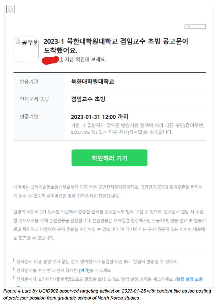 - On 2023-01-25, I received a sample from an activist based in South Korea who works on North Korean human rights. This campaign used a Naver alert message as an email lure, and directed the victim to a fake Naver login page hosted on a legitimate Medical Research Institutions website, indicating a watering hole attack. The server IP of this website was also seen on three other separate watering hole attacks I tracked. All three occasions saw credential harvesting campaigns targeting victims related to the MO of UCID902. These campaigns were also hosting Naver login pages. The websites used in the watering hole attacks described above were four differing Medical Research Institutions, which all shared the same web development company and server IP address.