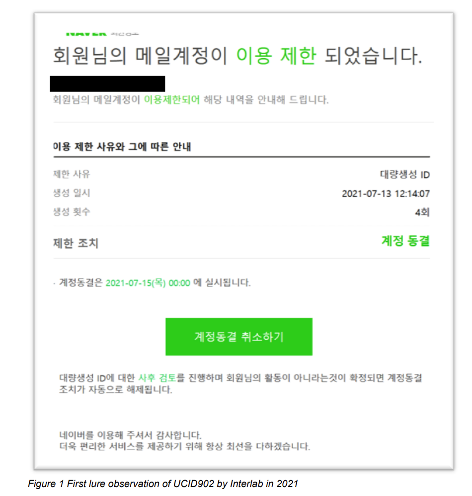 I first observed UCID902 on 2021-07-12 delivering credential phishing campaigns to activists based in the Republic of Korea. The lures aimed to appear as Naver security alerts, prompting users to input credentials, as seen in Figure 1. From 2021 to 2023, I have seen continued efforts by UCID902 to compromise credentials from victims with the same lures and phishing kits. These lures all are synonymous with Naver security events or similar.